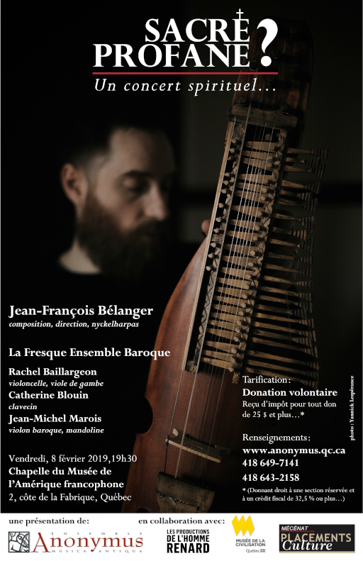 L'Ensemble Anonymus en collaboration avec les Musées de la civilisation de Québec vous convie à un concert original de Jean-François Bélanger aux nyckelharpas et La Fresque Ensemble Baroque. Ce concert, intitulé Sacré, profane ? – Un concert spirituel... , aura lieu le vendredi 8 février 2019, à 19h30, à la Chapelle du Musée de l'Amérique francophone, au 2, côte de la Fabrique, dans le Vieux-Québec.